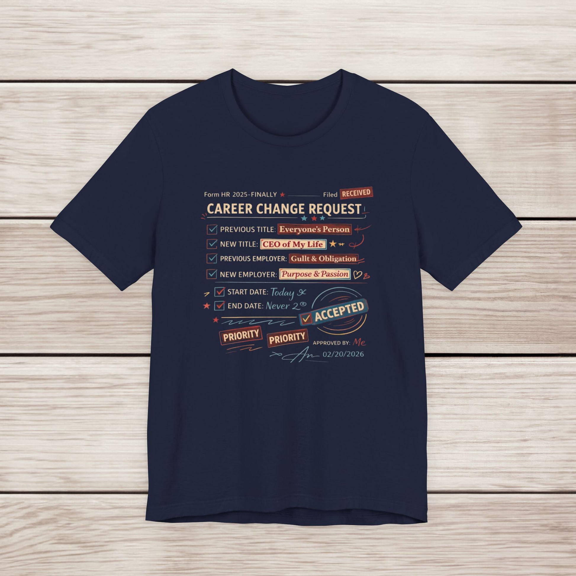 This tee wears like a wry handshake with change. Soft, breathable cotton sits close to the body with a retail crew neck that layers easily under a jacket or stands alone. The front art reads like a playful ‘career change request’ form—typed checkboxes, stamped priorities and a confident “Accepted” —a quiet celebration for anyone stepping into new work, a different rhythm, or starting over. It settles into weekends, coffee-shop planning sessions, and first days with the steady comfort of a well-made staple. Ethically produced and lightweight, it’s the kind of shirt you reach for on days you want your intentions to be readable before you speak.