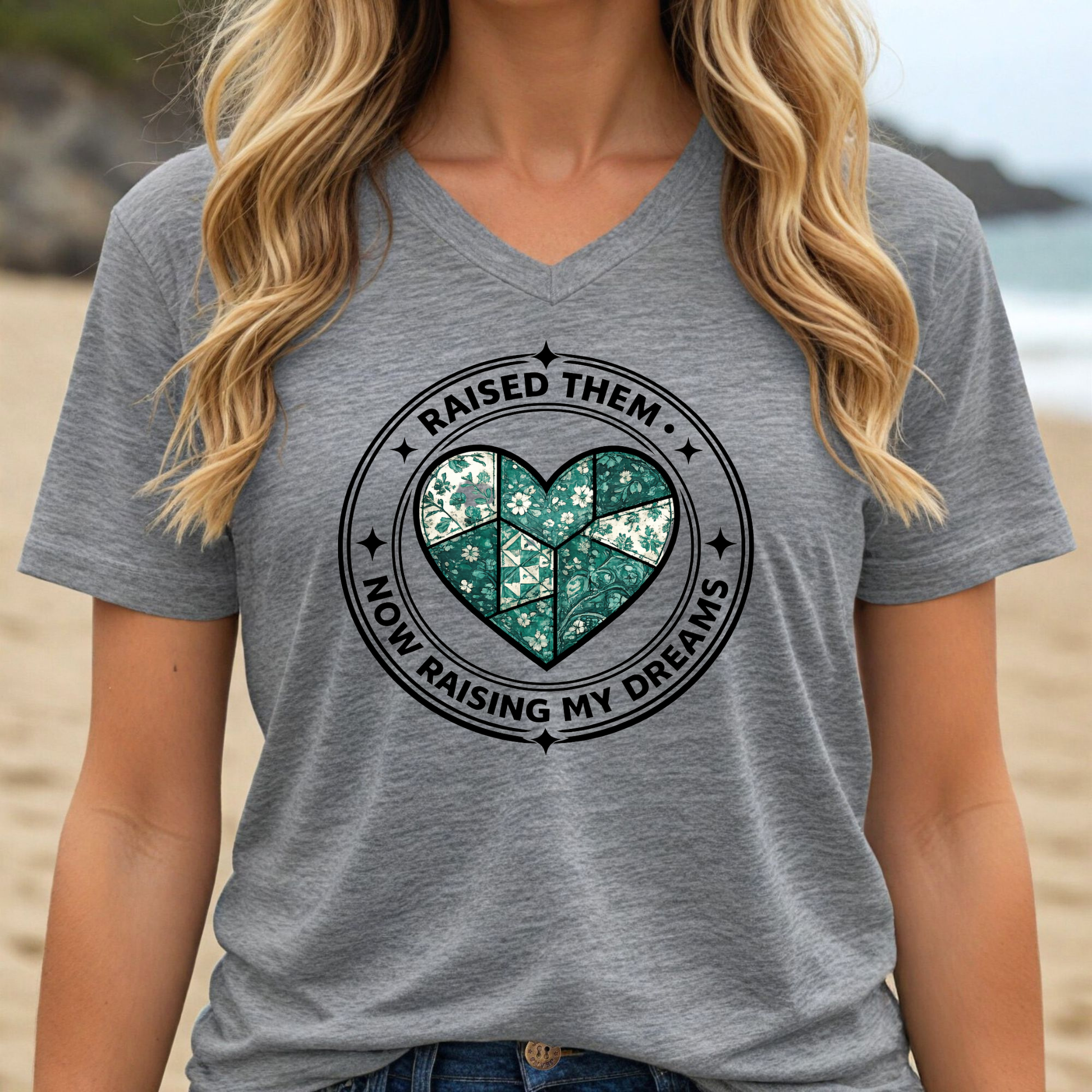 For the mom whose kids are grown and it's finally her turn. Circular badge design with a patchwork-style heart symbolizing the transition from raising children to building your own dreams. Whether you're a mom or grandma, this one's for the woman who gave everything to them and is now claiming something for herself.